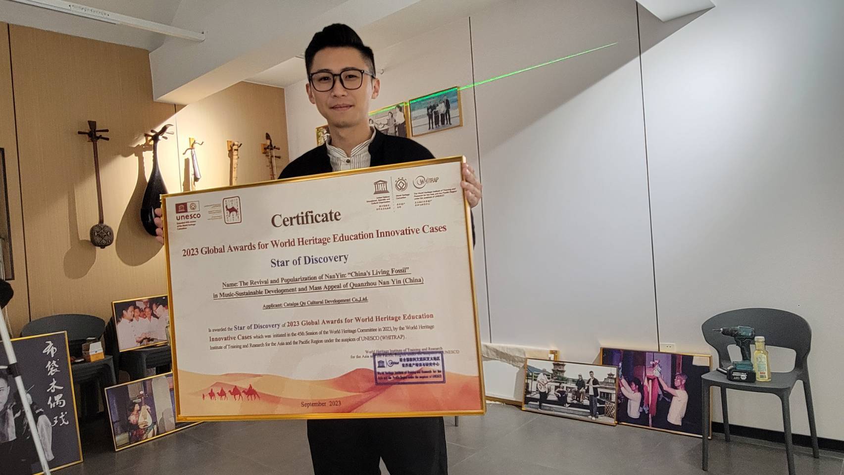 曾在登上鯉城天台時,參訪了沈老師的南音工作坊,他正在請人布置,張掛聯合國頒贈的獎狀,並有幸在星月下聆賞他的唱奏。