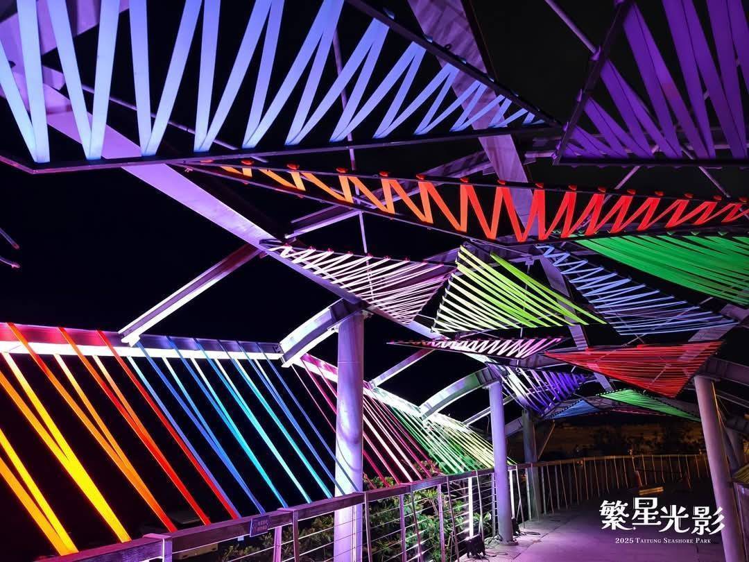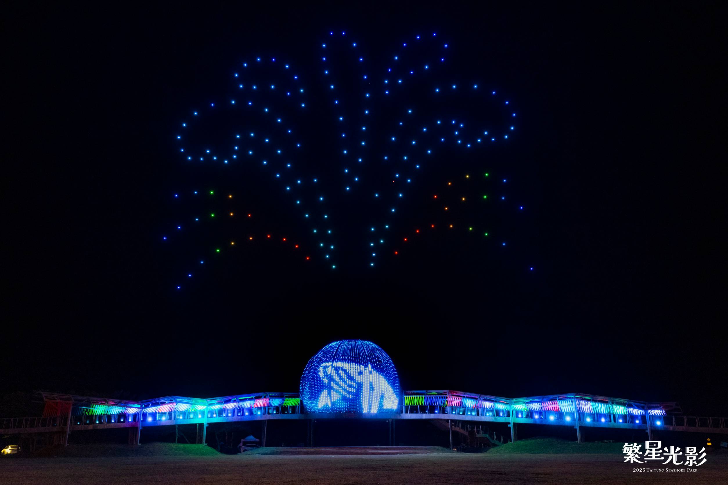 此次展覽核心作品「繁星光影」,以直徑13公尺的光之球體為中心,搭配超過萬顆點光源及兩側光織廊道,形成如星河般流動的奇幻場景。每晚7點至10點,每30分鐘一場聲光動畫秀動態展演吸引遊客駐足,開幕日更有無人機編隊表演點亮夜空,為臺東夜間觀光樹立全新標竿。