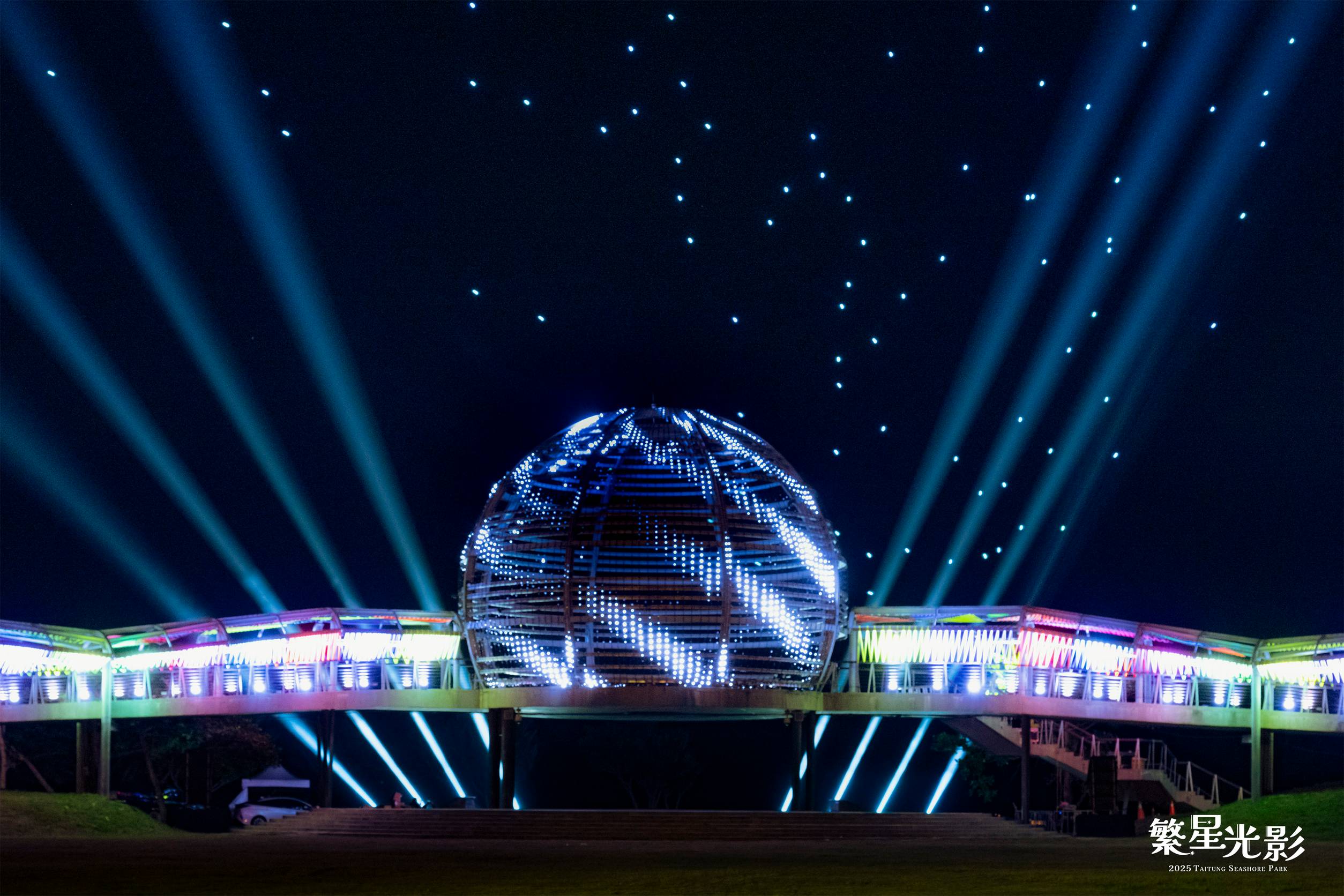 臺東縣政府推出品牌活動-「台東最美星空」,近日再傳捷報,由臺東縣政府交通及觀光發展處策劃的「2025繁星光影」,結合空間設計、燈光藝術與科技創新,成功將臺東海濱公園原有的國際地標球體結構重新活化,蛻變為一座宛如宇宙星球降臨人間的夢幻場域。展覽不僅打破傳統地景裝置的呈現方式,更透過視覺藝術創作轉化成地方生命力,展現出臺東在地文化復興與藝術再生的堅韌精神。