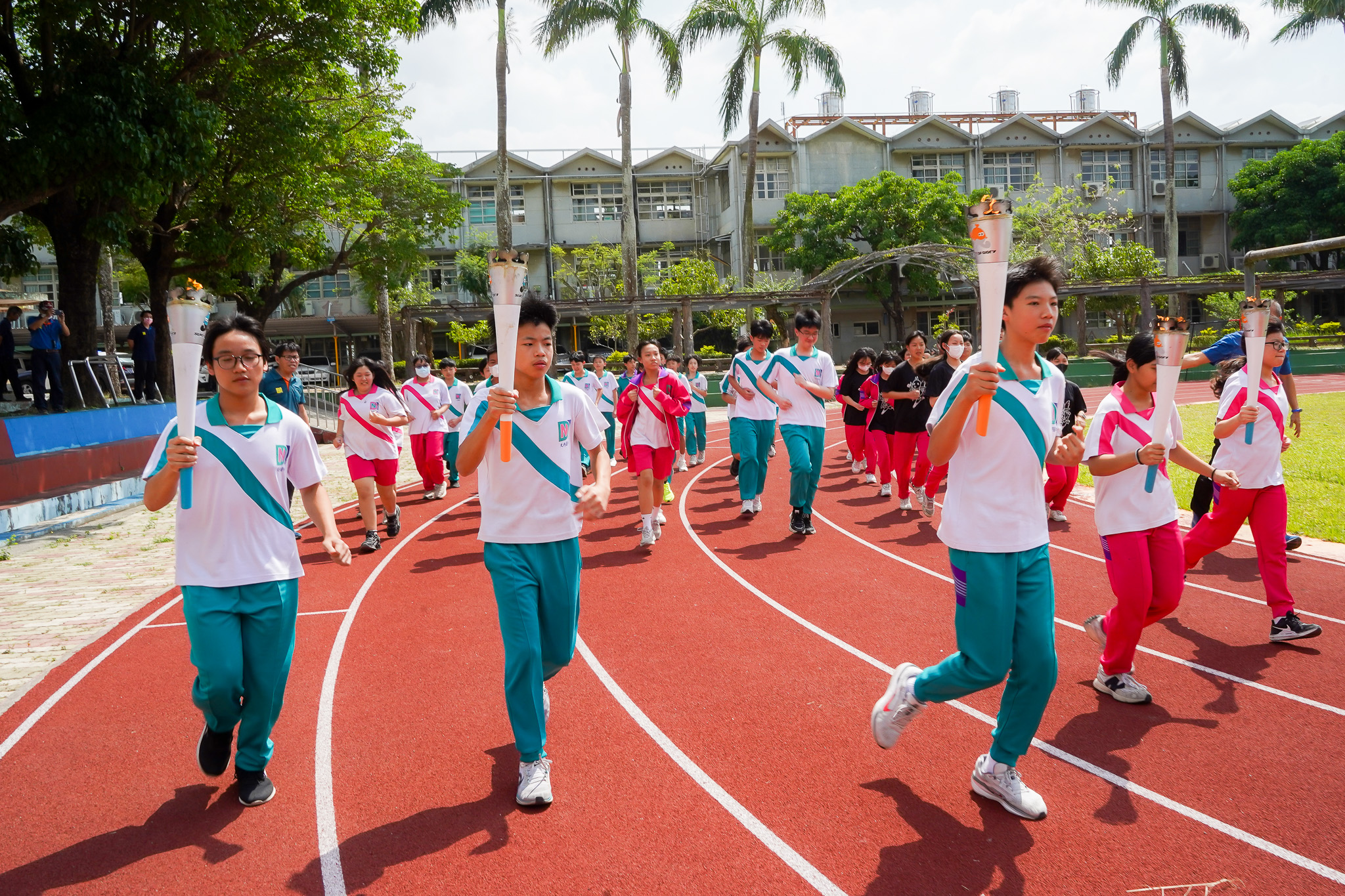 今日傳遞自麻豆國中揭開序幕,沿途依序抵達善化、安定、新市、新化、山上、大內、官田、六甲、柳營,下營等學校。各校無不全力投入迎接,從歡呼旗海、戰鼓雷動、傳統舞獅、到武術展演,呈現各具特色的在地風采與青春動能,如新市國中鼓隊鼓聲震天,以磅礡氣勢迎接聖火到來,六甲國中武術隊展現精湛的傳統武術技藝,剛柔並濟地呈現武術與體育之美。聖火所到之處,不僅點亮校園,更凝聚了社區、師生與在地文化的深厚情感,展現出臺南多元且充滿活力的教育與體育氛圍。