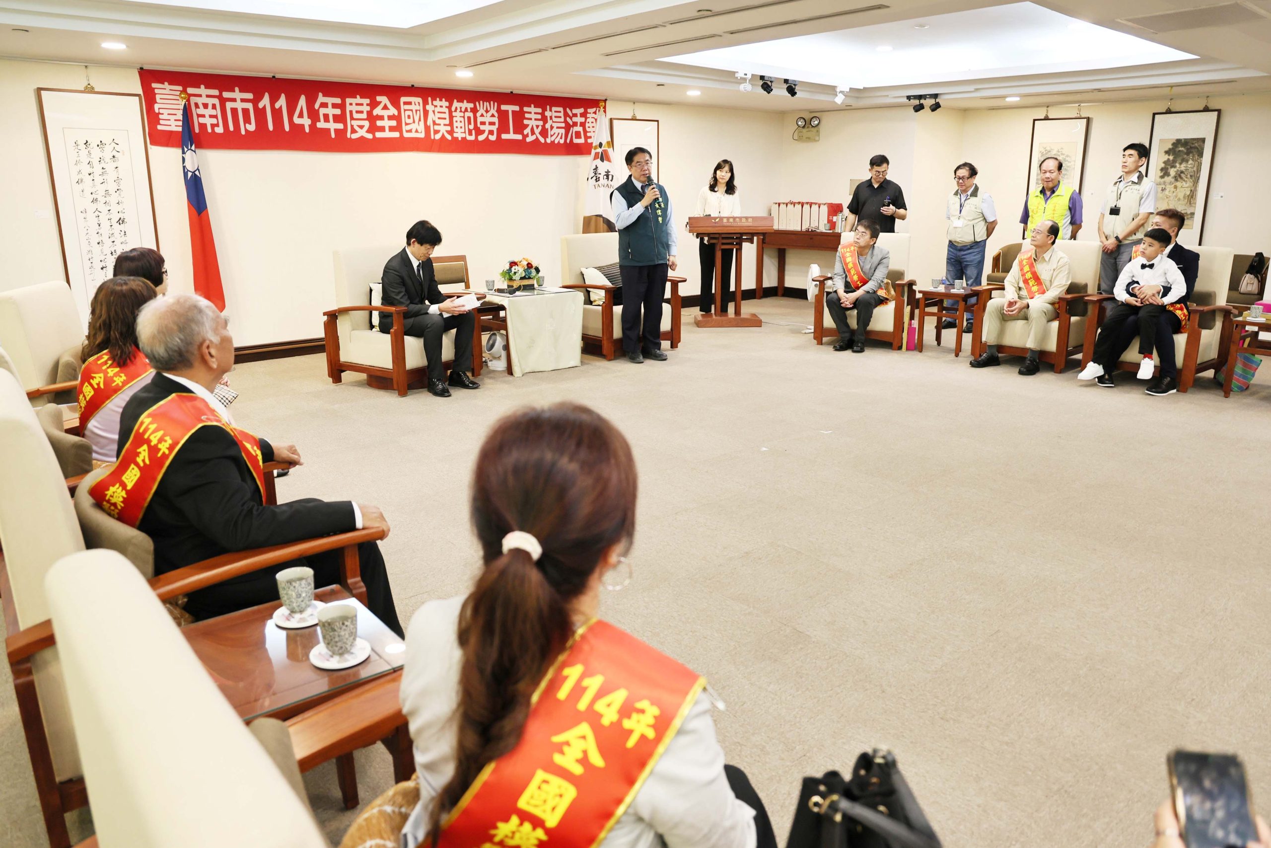 一年一度勞動節即將到來,每年勞動部皆辦理全國模範勞工選拔,今(114)年度台南市民獲獎者共計7名,台南市長黃偉哲今(21)日特別表揚獲選全國模範勞工的台南市民,並由副市長葉澤山頒贈「勞工楷模」木匾及致贈紀念品。許多得獎者家人也親臨現場,現場洋溢著溫馨與感動,一同分享榮耀時刻。