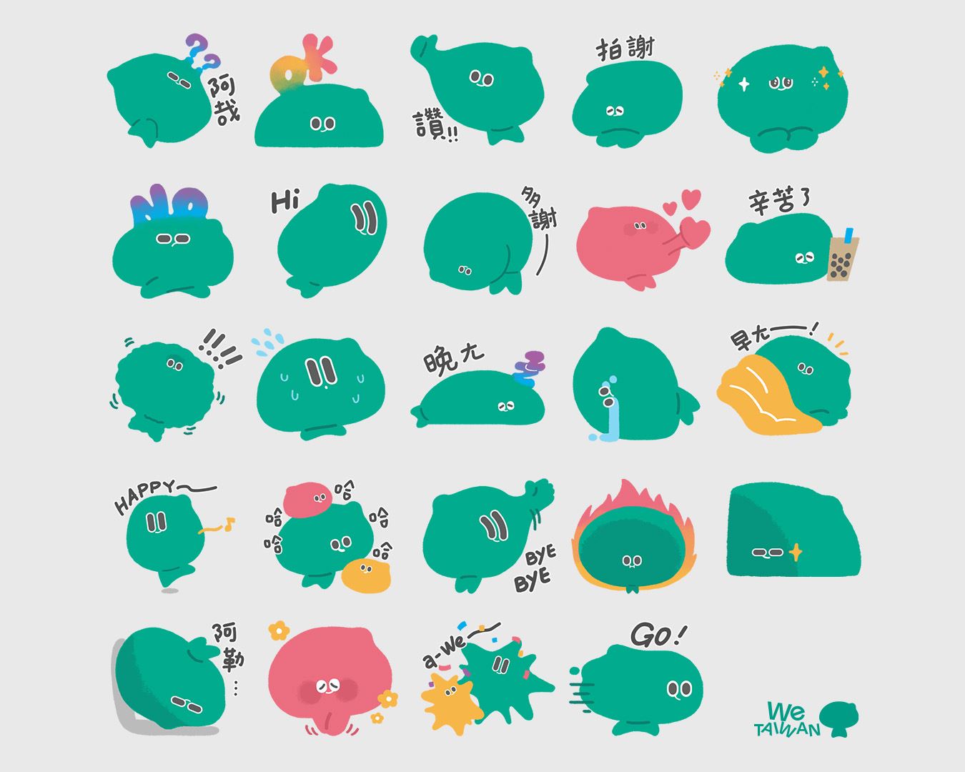 「a-We」貼圖規劃在2026年推出4款主題,更特別推出日文版,內容涵蓋各種生活情境,首波在今日登場的「日常款」,以柔軟變化多端的身形,以及「阿哉」、「拍謝」、「多謝」、「阿勒」等超日常用語,陪伴大家分享生活點滴。陸續將推出為世界棒球經典賽熱力應援的動態貼圖「棒球款」;呈現臺灣人熱情、樂於助人特質的「島民款」;以及展現a-We無限變幻能力的「奇蹟款」。