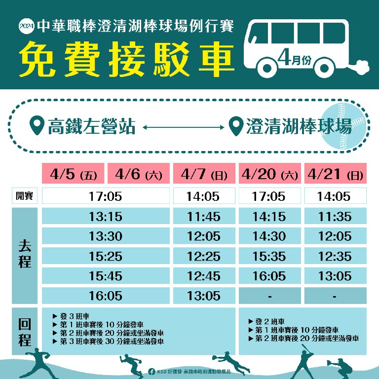 4月份接駁車相關訊息如下,歡迎球迷多加利用!(5至9月接駁車班次時間請持續關注高雄市政府運動發展局臉書KSD好運發貼文https://www.facebook.com/ksdkcg/)