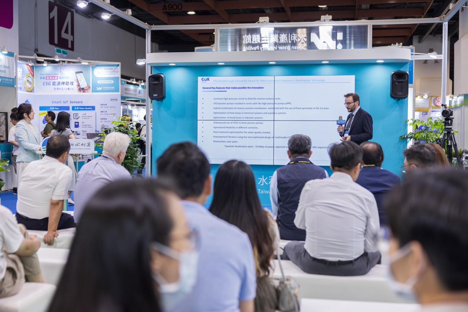 為推動水利產業的永續發展,經濟部水利署今年特別徵集19家國內頂尖的水利產業相關廠商,共同打造「水利產業主題館」,展館涵蓋三大主題區以「智慧水管理」、「永續水淨零」和「創新水資源」三大主題為核心,展出一系列的創新產品和技術,包括AIoT智慧水管理系統、智能監控設備、先進的水質檢測技術、海水淡化設備、汙水處理技術、小水力發電、海上波浪能發電系統等,展現了台灣水利產業的整體實力,共創更龐大的商機。