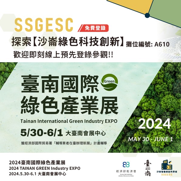 歡迎即刻線上預先登錄參觀「2024臺南國際綠色產業展」(https://cec.ctee.com.tw/green/prereg/),掌握綠色轉型策略、創新應用、節能解決方案、未來趨勢等各種綠色產業相關議題及商機!