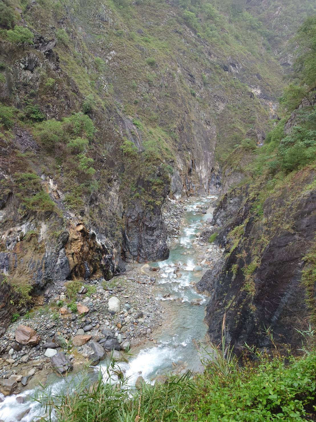 車隊通過梅山口後,進入新一段的路況,車子開始明顯爬坡,中央山脈高聳岩壁,隱約可見曾經崩塌的留痕,在前進下一站天池、中之關的路途,部分易塌路段,偶見蜘蛛人沿著山壁吊掛,埋設排水管及加固水泥岩壁,他們是一群無名英雄。