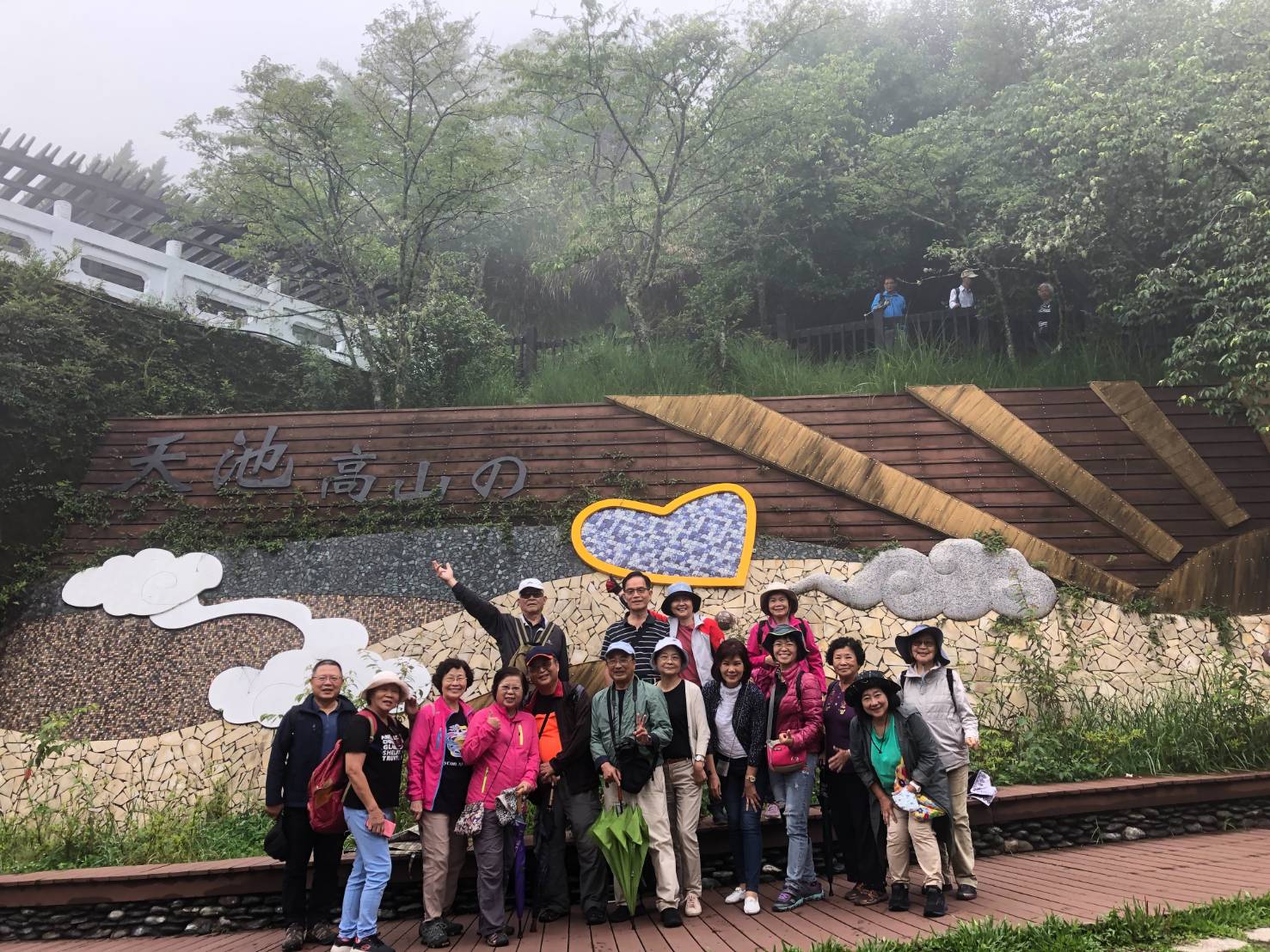 近午抵天池、中之關古道,此時雨勢轉大,山在虛無飄渺間,放眼皆是一片滾動雲霧的白牆,拾級而上即是長青祠,柱上置放佛教二顆舍利子,側對中央山脈,寄意祈求平安,同時向拓墾南橫公路116位犧牲的開路英雄致意及追念,循秘徑而上即是天池,兩旁山坡毛地黃,誠意十足開出串串淡紫花朵,美不勝收。天池小巧秀麗,初看並不起眼,不過倒成部分宗教靈修朝聖之地。