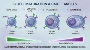 在狼瘡腎炎、硬皮症、或重症肌無力的重症患者體內,最致病、最難纏的自體抗體往往是由「長壽漿細胞」持續產生的。這些漿細胞躲藏在骨髓中,對傳統的免疫抑制劑、甚至CD19 CAR-T具有抗性。BCMA CAR-T的出現,填補了這一重大缺口,BCMA CAR-T能精準識別並摧毀這些持續製造異常自體抗體的漿細胞,從源頭阻斷致病抗體的產生。