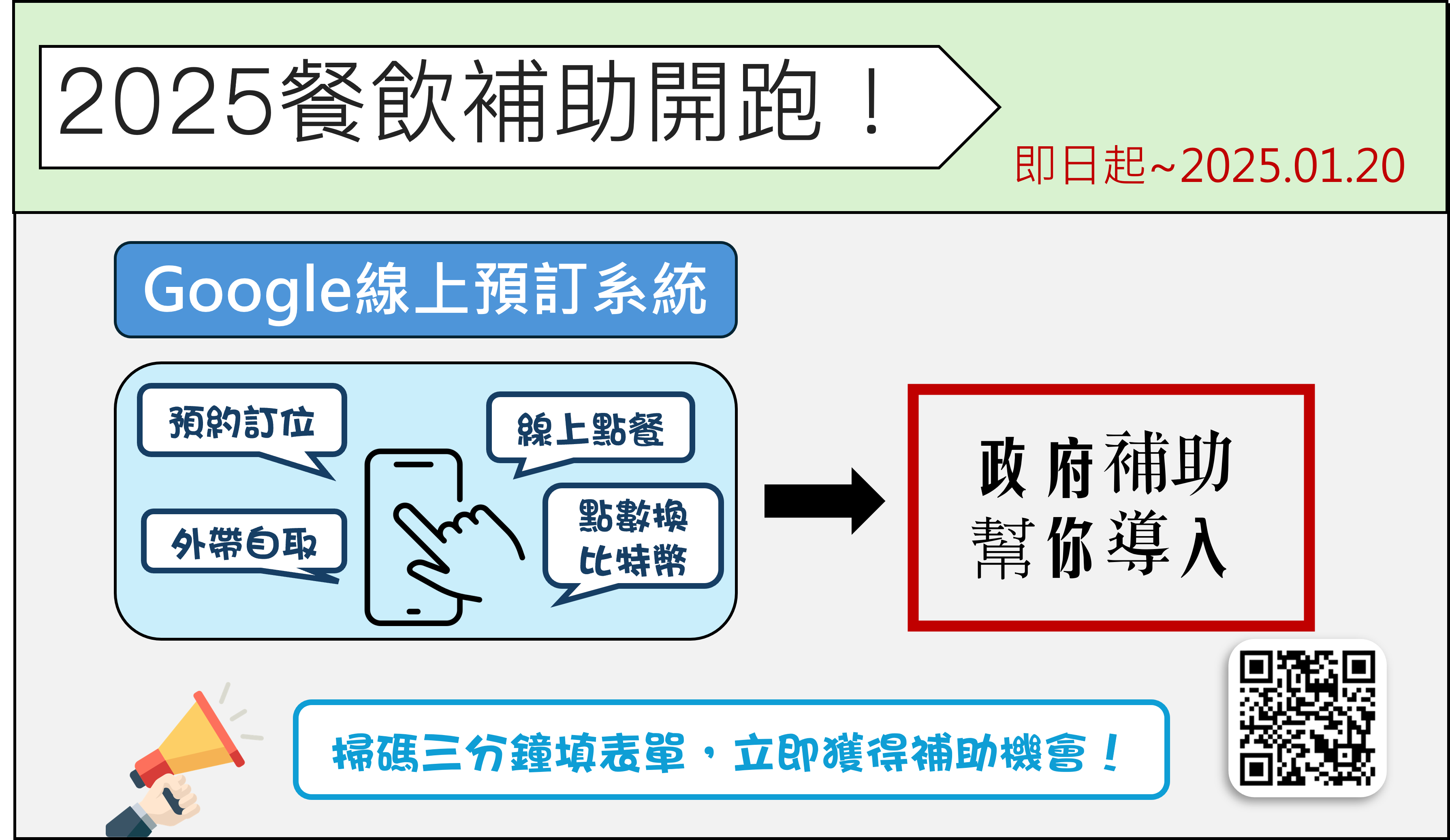產業數位化是國際趨勢,未來政府勢必會持續推動,將會公布更多產業轉型專案補助,現在參與店家募集活動,將可配合政府進行餐飲店家無痛轉型。